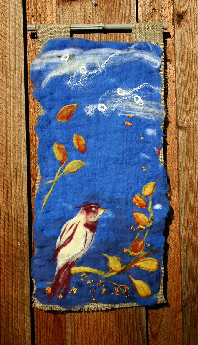 Created of hand dyed Merino wool, silk and linen.