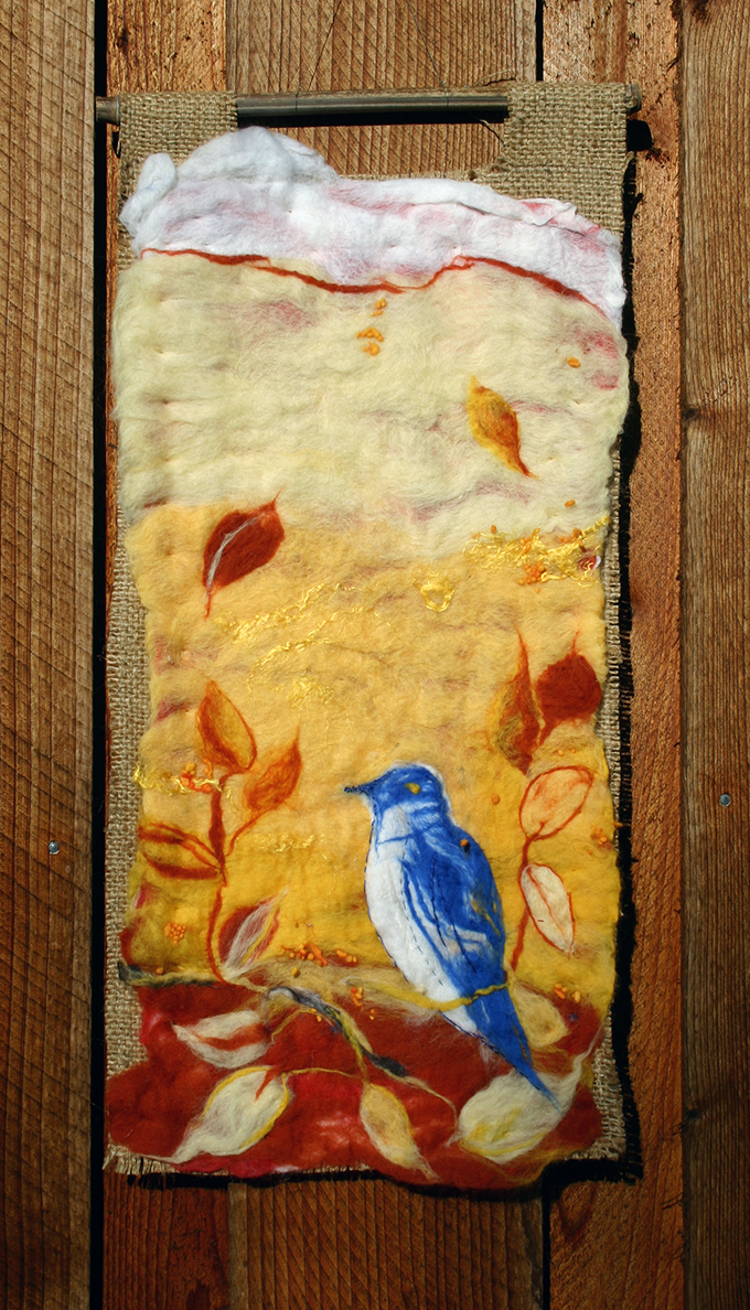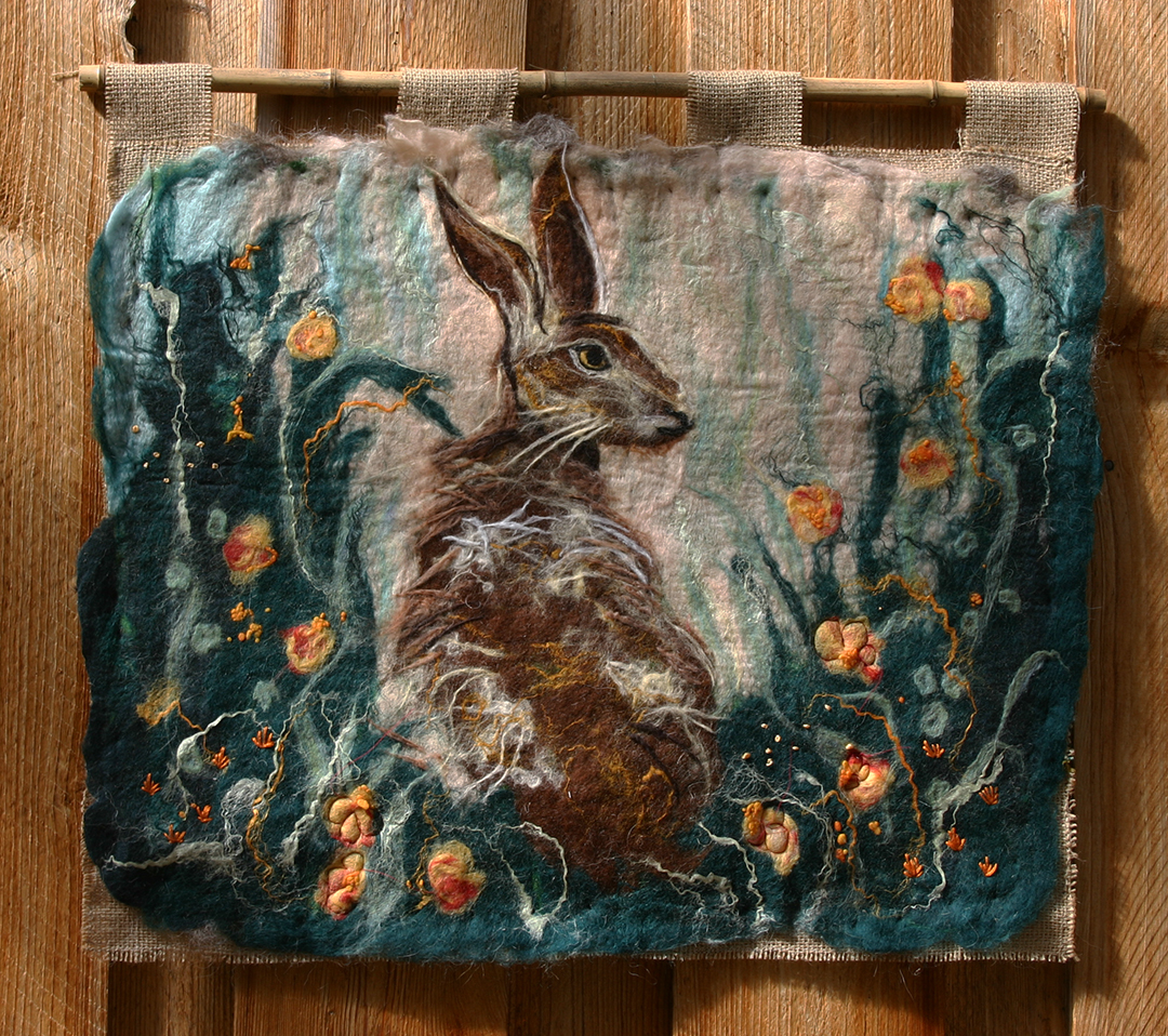 Merino wool and silk, hand embroidered, all attached to a burlap fibre background.