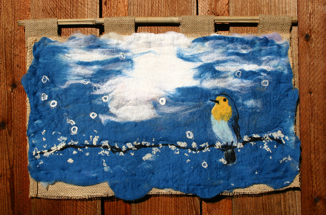 All merino wool, with some tussah silk threads. Vibrant colours, shades of blue and brilliant Sun yellow, a hint of gold thread. All hand dyed and hand created using different fibre techniques. The tapestry itself is attached to a hand loomed hemp fibre cloth.
