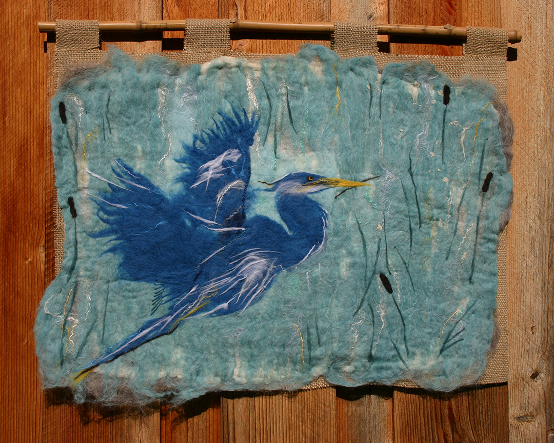 This work is created of pure British merino wool tops, and silk. It is a fine combinations of light turquoise blue and the iridescent feather blue. All hand dyed and hand created, painting with wool and silk. The tapestry is set onto a hand loomed raw burlap background.