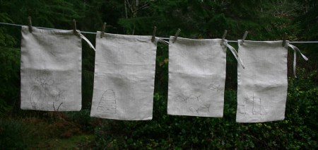 So, these linen bags are about 11 x 18 in and they are all embroidered, yes, natural colour linen with Bordeaux red colour embroidery. I create them as time permits. And I do keep up with all the requests and special orders for these and more.