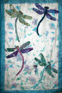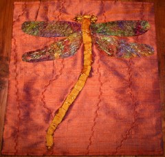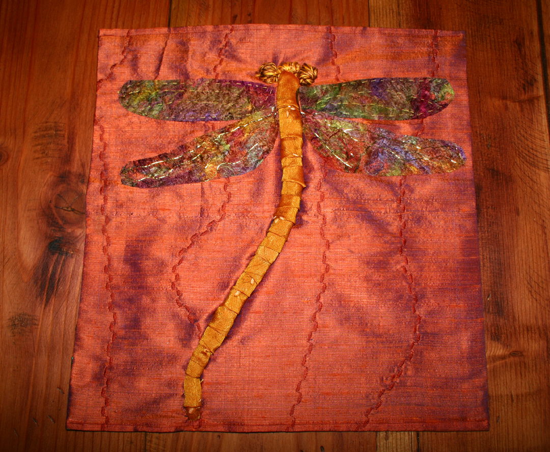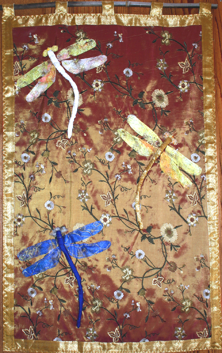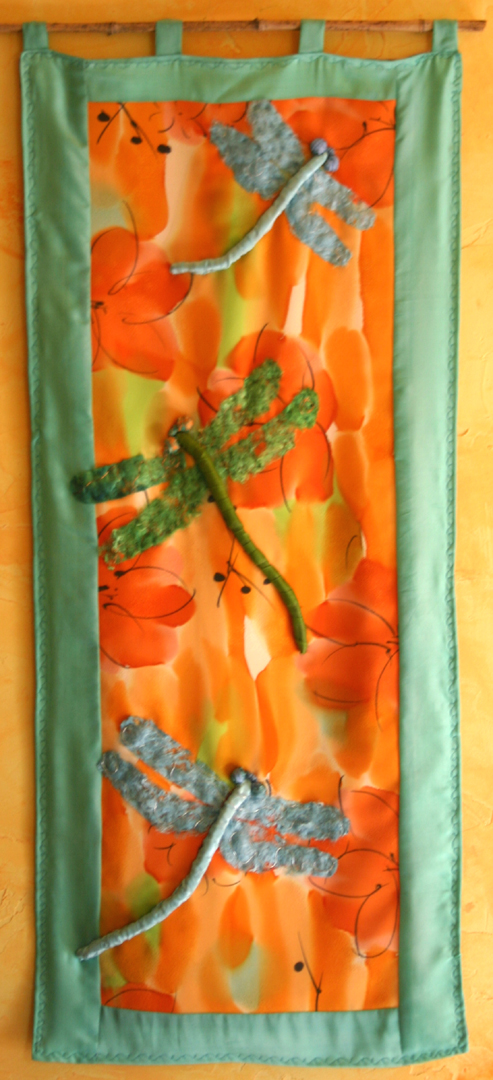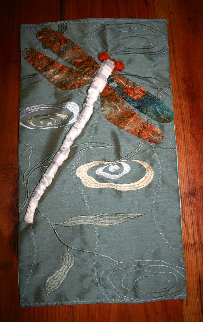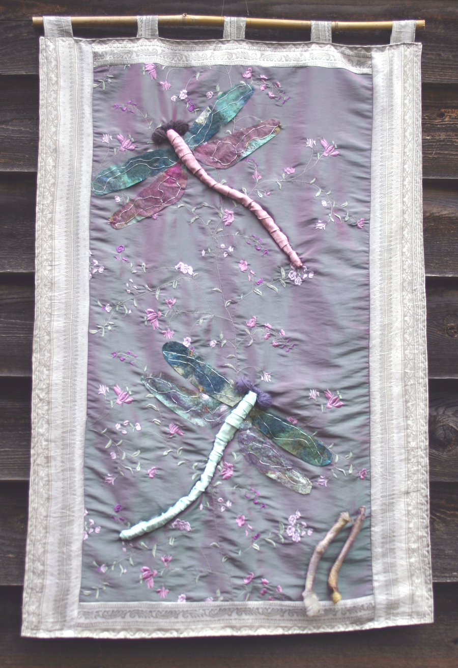 The dragonfly’s wings have been created using silk fusion, hand dyed, stitch and embroidered by me. It is a very creative process that I cherish, as it transports me into a different realm. Their iridescence, their beauty fascinate me throughout the summer season .
