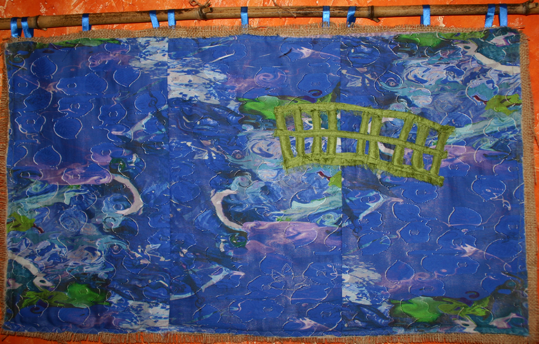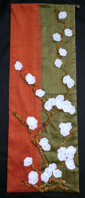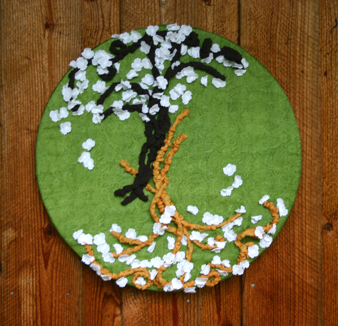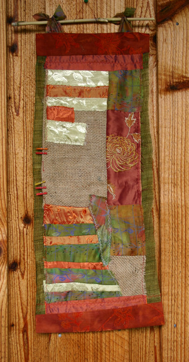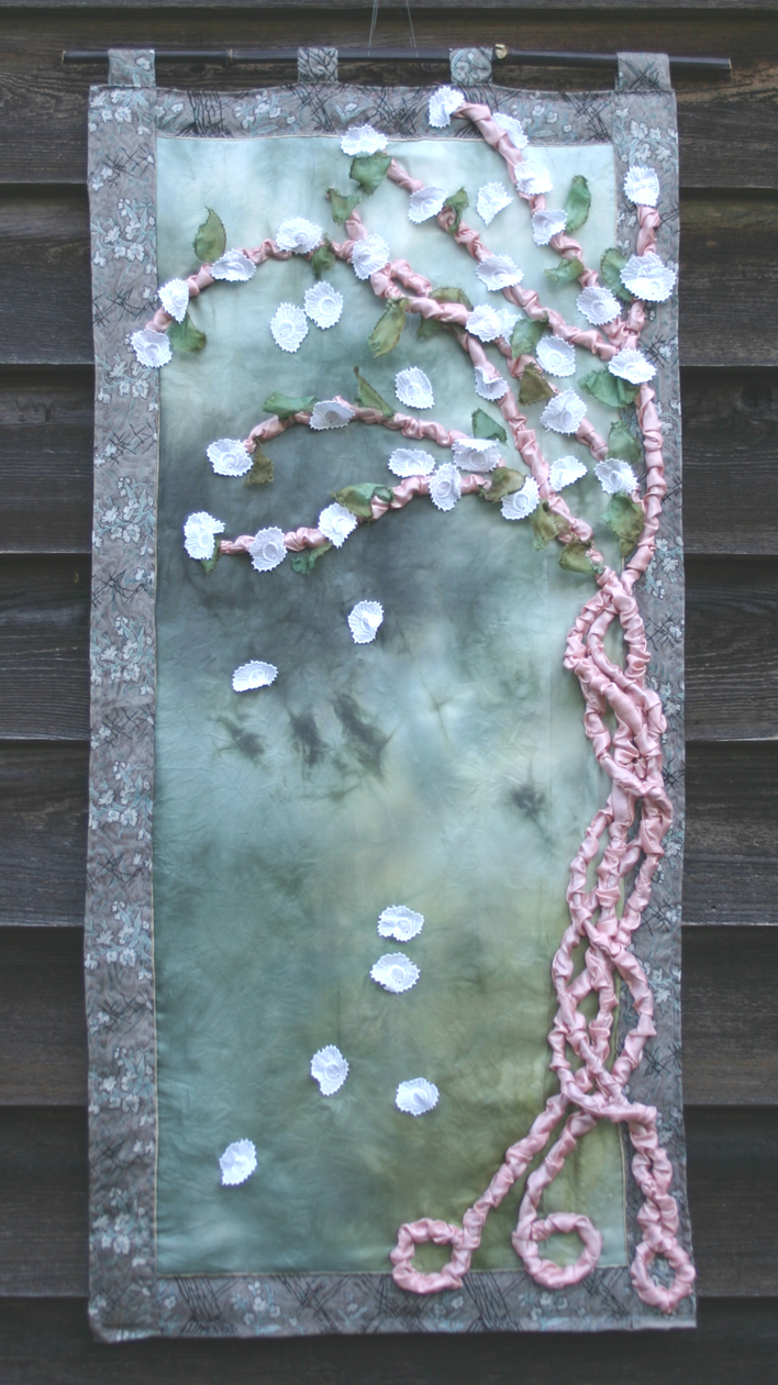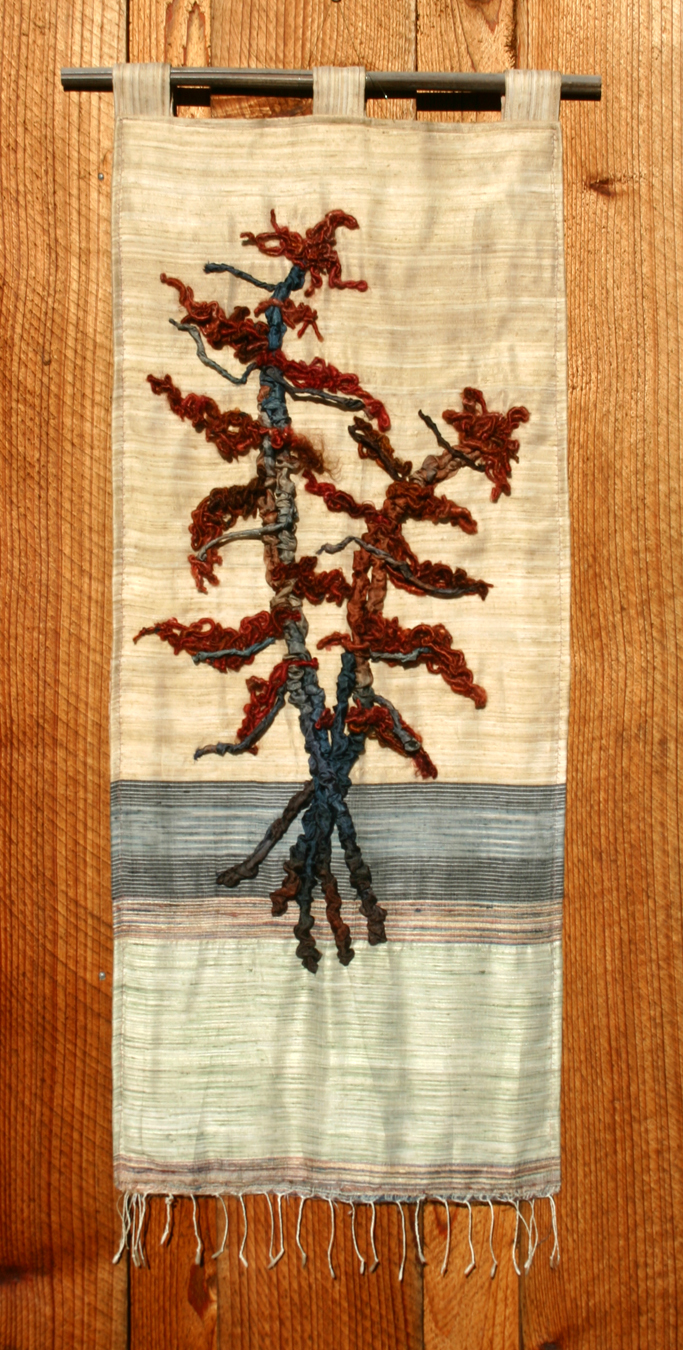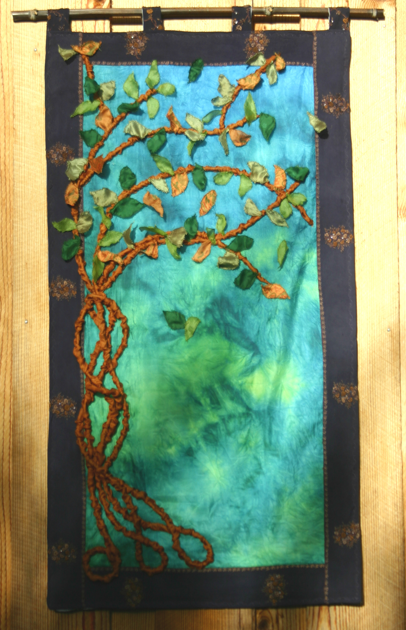 The entire background is hand dyed silk of Sun light greens, with gold border of silk. The tree itself is of hand dyed hand spun wool, little tiny silk leaves gently move in a breeze.