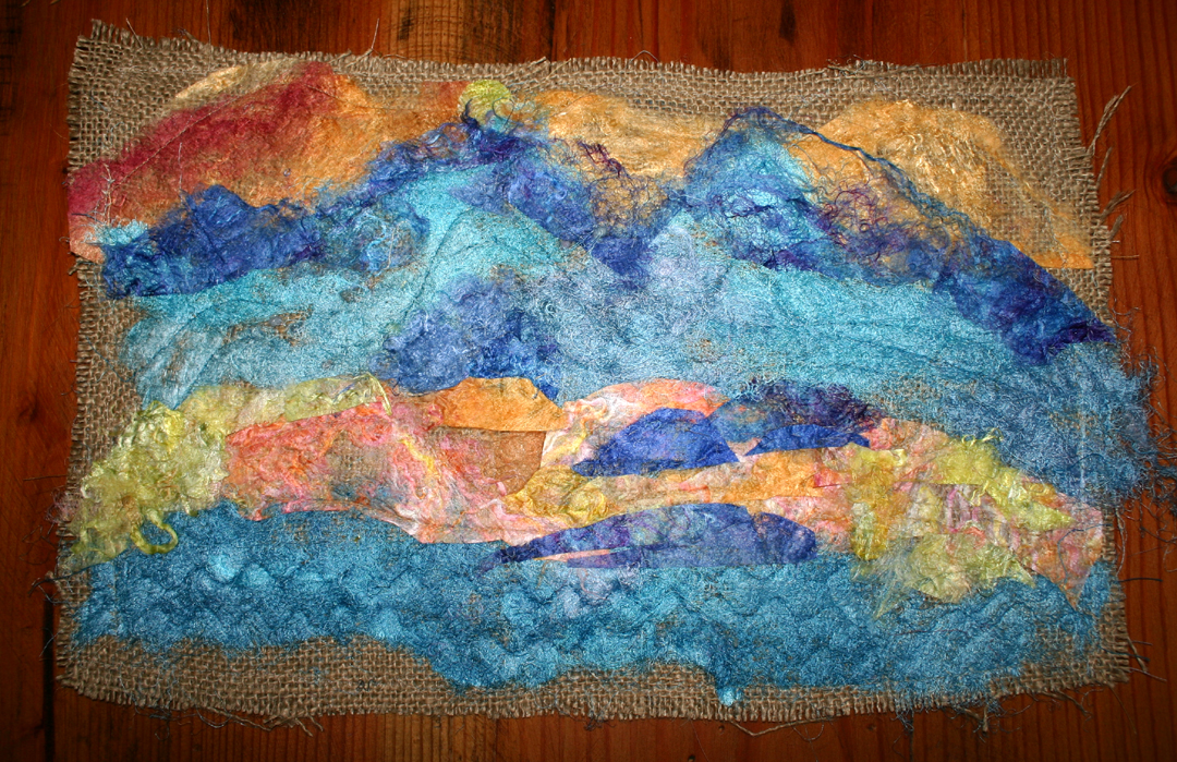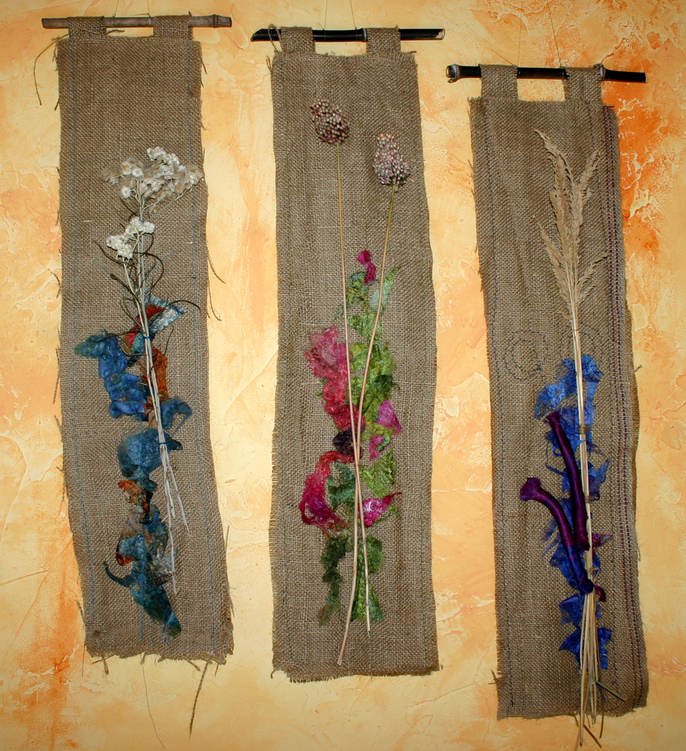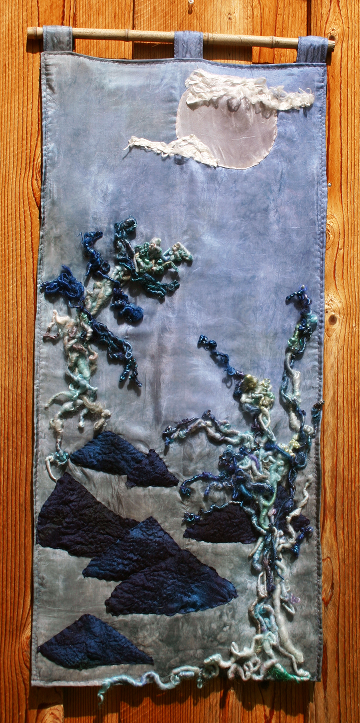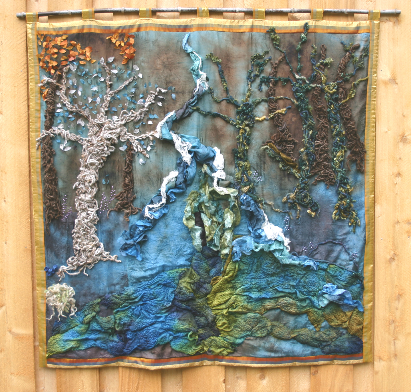 The tapestry itself is created of hand dyed silks and hand dyed hand spun wool.