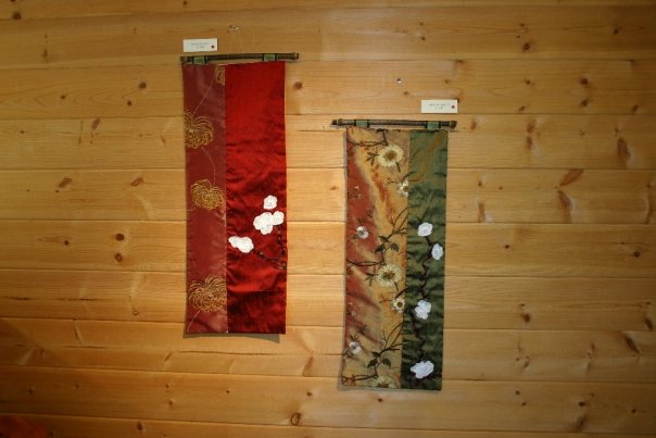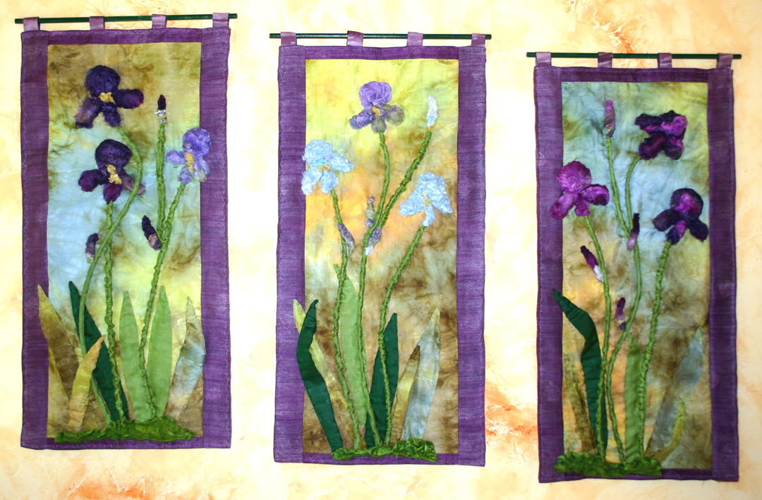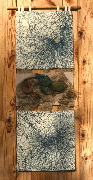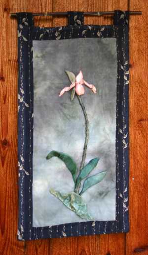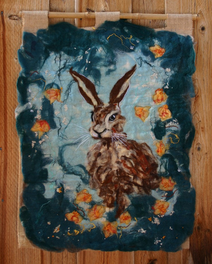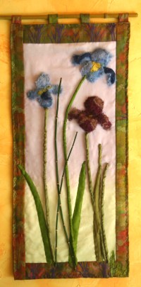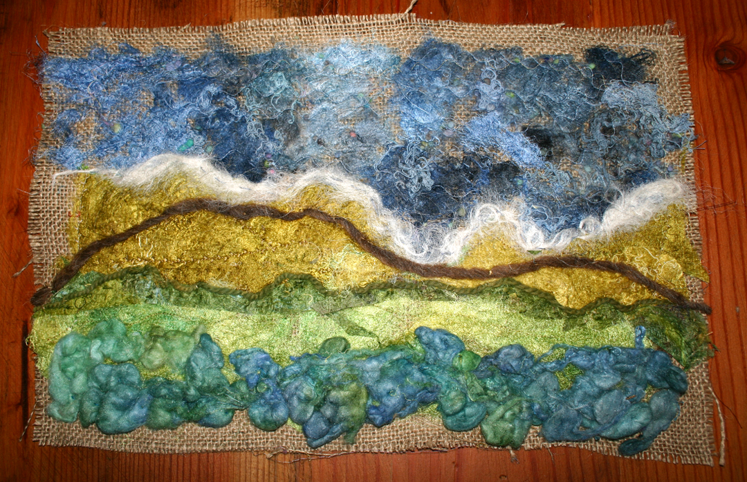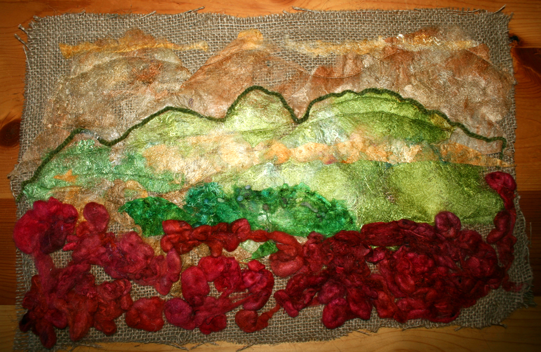 The tapestry itself is created of hand dyed silks and hand dyed hand spun wool.