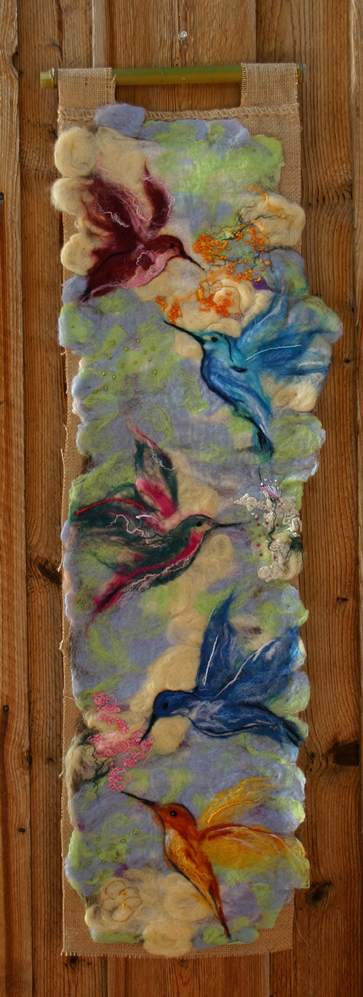 This work is created of pure British merino wool tops, and silk. It is a fine combinations of sky blue, ocean blue, water blue and the iridescent feather blue. All hand dyed and hand created, painting with wool and silk. The tapestry is set onto a hand loomed raw hemp background.